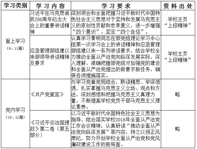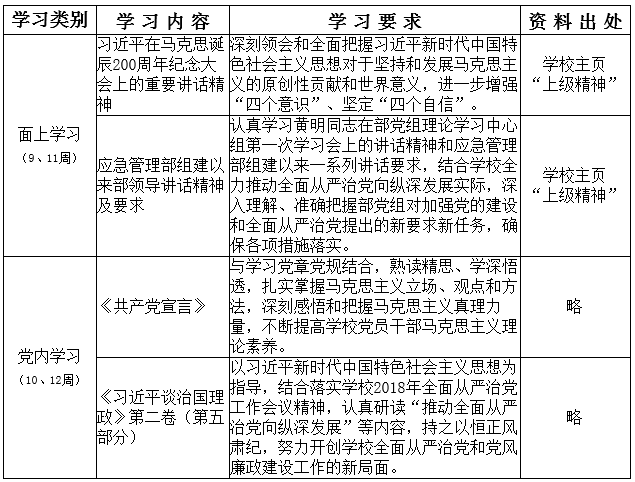 认真学习黄明同志在部党组理论学习中心组第一次学习会上的讲话精神和应急管理部组建以来一系列讲话要求,结合学校全力推动全面从严治党向纵深发展实际,深入理解、准确把握部党组对加强党的建设和全面从严治党提出的新要求新任务,确保各项措施落实。 |