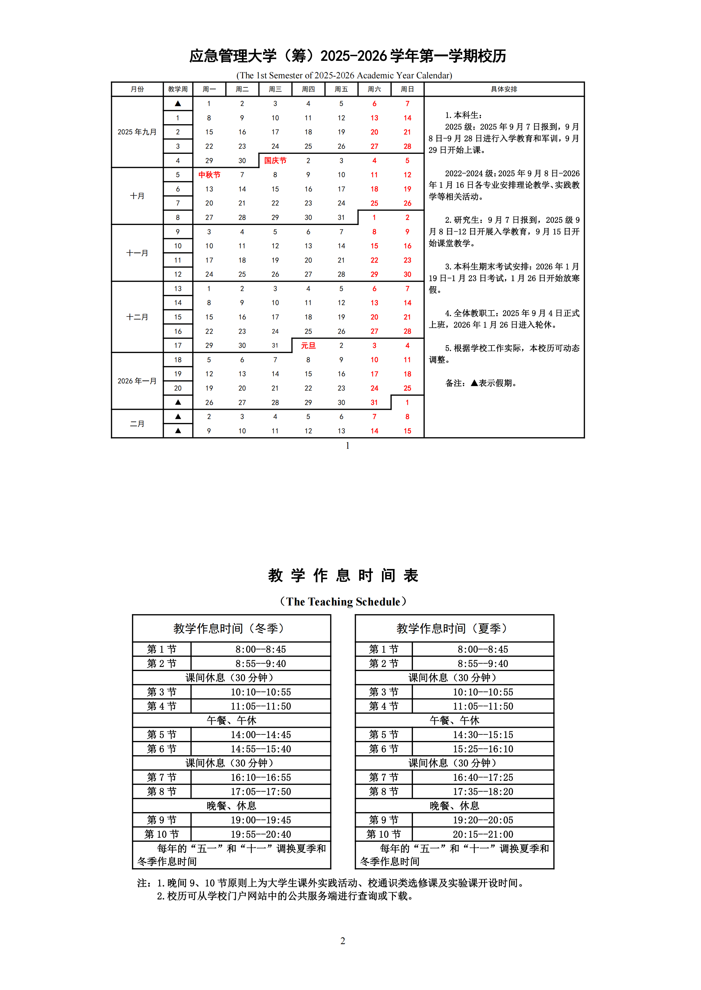 应急管理大学(筹)2025-2026学年第一学期校历